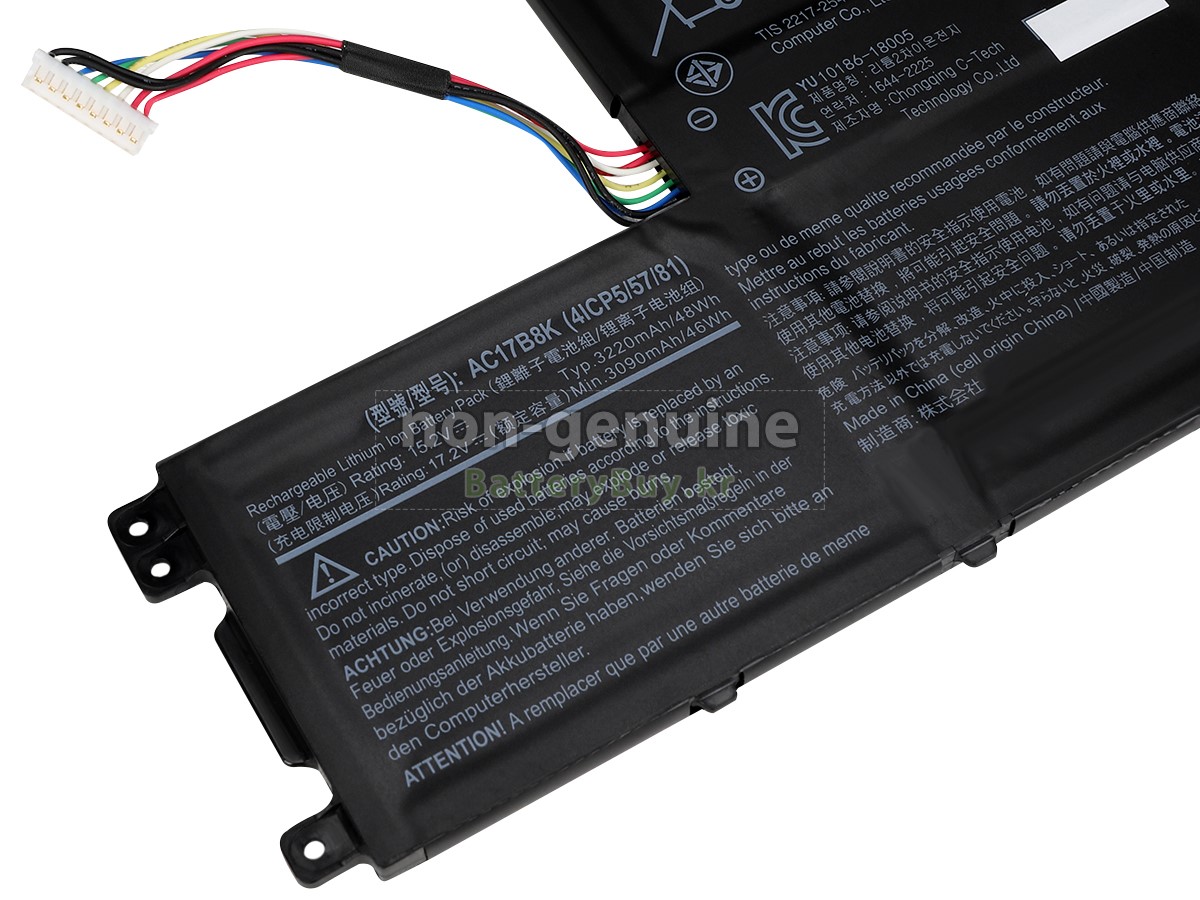 본 새로운 Acer AC17B8K 대체용 배터리는 삼성, 파나소닉과 LG 등 오리지날 공장의 고품질 리튬이온셀을 적용하였고, 배터리의 케이스는 내용성 ABS플라스틱을 사용한 제품입니다. BatteryBuy.kr는 제품 안전성에 대해 요구가 엄격한 바 해당 Acer AC17B8K 배터리 제품은 전부KC, CE, UL, ROHS, ISO 9001/9002 등 일련의 안전인증을 통과하여 국제표준에 부합되며 오리지날사의 규격과 100%로 호환가능하며 오리지널 AC17B8K 배터리와 완전 매칭 심지어 초과 가능한 성능을 자랑하고 있습니다. 해당 Acer AC17B8K 배터리의 충/방전 주기는 600회좌우인 바 최적의 배터리 라이프를 선사하고 있습니다.