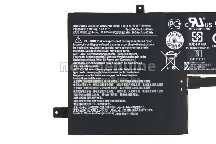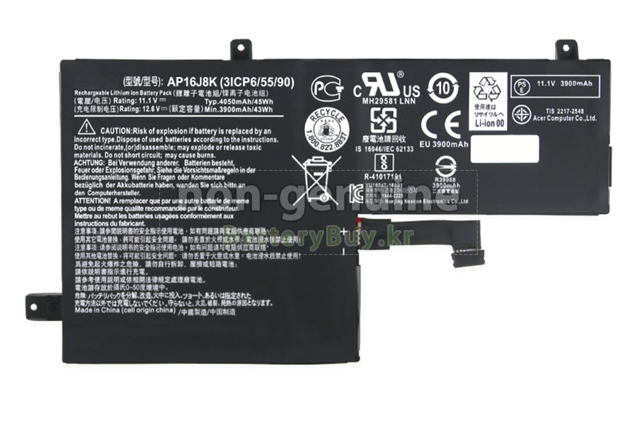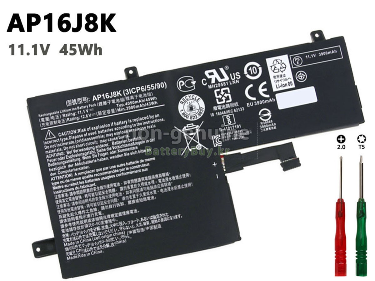 본 새로운 Acer AP16J8K(3ICP6/55/90) 대체용 배터리는 삼성, 파나소닉과 LG 등 오리지날 공장의 고품질 리튬이온셀을 적용하였고, 배터리의 케이스는 내용성 ABS플라스틱을 사용한 제품입니다. BatteryBuy.kr는 제품 안전성에 대해 요구가 엄격한 바 해당 Acer AP16J8K(3ICP6/55/90) 배터리 제품은 전부KC, CE, UL, ROHS, ISO 9001/9002 등 일련의 안전인증을 통과하여 국제표준에 부합되며 오리지날사의 규격과 100%로 호환가능하며 오리지널 AP16J8K(3ICP6/55/90) 배터리와 완전 매칭 심지어 초과 가능한 성능을 자랑하고 있습니다. 해당 Acer AP16J8K(3ICP6/55/90) 배터리의 충/방전 주기는 600회좌우인 바 최적의 배터리 라이프를 선사하고 있습니다.