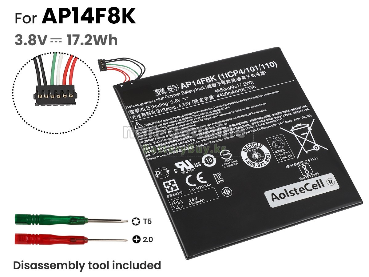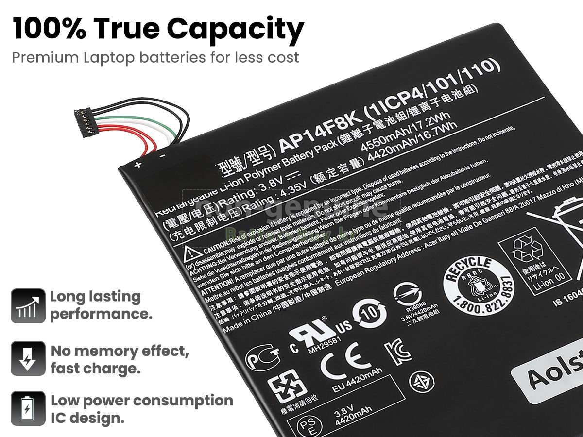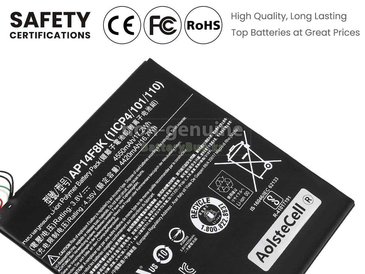 본 새로운 Acer Iconia Tab A1-850 대체용 배터리는 삼성, 파나소닉과 LG 등 오리지날 공장의 고품질 리튬이온셀을 적용하였고, 배터리의 케이스는 내용성 ABS플라스틱을 사용한 제품입니다. BatteryBuy.kr는 제품 안전성에 대해 요구가 엄격한 바 해당 Acer Iconia Tab A1-850 배터리 제품은 전부KC, CE, UL, ROHS, ISO 9001/9002 등 일련의 안전인증을 통과하여 국제표준에 부합되며 오리지날사의 규격과 100%로 호환가능하며 오리지널 Iconia Tab A1-850 배터리와 완전 매칭 심지어 초과 가능한 성능을 자랑하고 있습니다. 해당 Acer Iconia Tab A1-850 배터리의 충/방전 주기는 600회좌우인 바 최적의 배터리 라이프를 선사하고 있습니다.