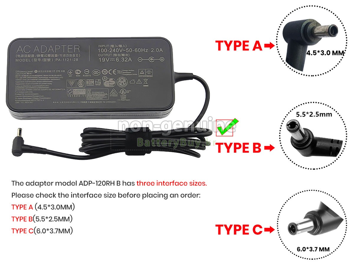 답: 출력 파라미터와 연결 유형에 집중하면 된다. 출력 전압은 원래 어댑터와 일치하거나 1V 이하의 차이가 있어야 하며 출력 전류는 원래 Asus ADP-120RH b 어댑터와 약간 크거나 같아야 합니다. 연결 유형은 기기 충전 포트에 꽂을 수 있도록 합니다. 연결 사이즈 판단이 어려우시면 기기 모델명을 알려드리기 위해 연락주시면 됩니다.