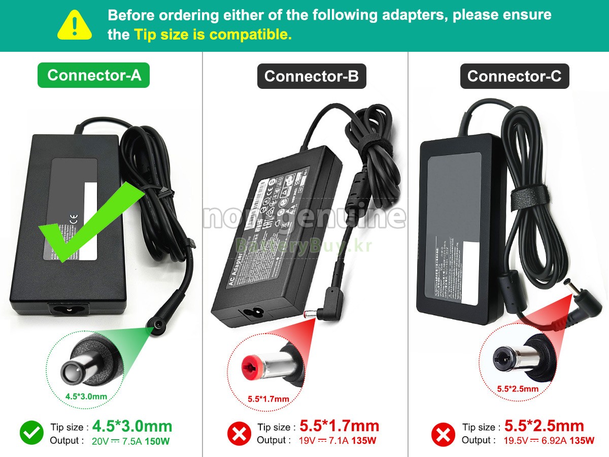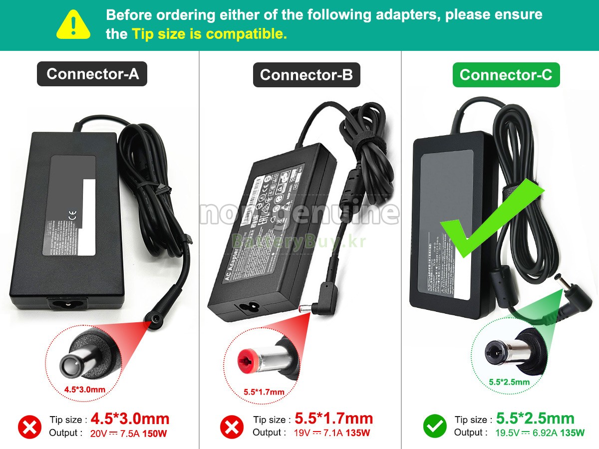답: 출력 파라미터와 연결 유형에 집중하면 된다. 출력 전압은 원래 어댑터와 일치하거나 1V 이하의 차이가 있어야 하며 출력 전류는 원래 MSI A18-135P1A 어댑터와 약간 크거나 같아야 합니다. 연결 유형은 기기 충전 포트에 꽂을 수 있도록 합니다. 연결 사이즈 판단이 어려우시면 기기 모델명을 알려드리기 위해 연락주시면 됩니다.