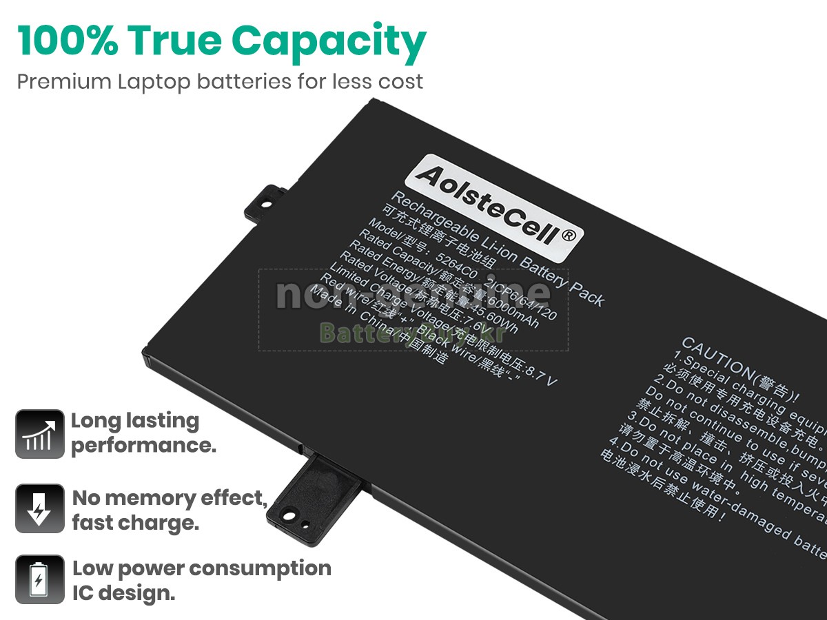 본 새로운 AolsteCell 5264C0 대체용 배터리는 삼성, 파나소닉과 LG 등 오리지날 공장의 고품질 리튬이온셀을 적용하였고, 배터리의 케이스는 내용성 ABS플라스틱을 사용한 제품입니다. BatteryBuy.kr는 제품 안전성에 대해 요구가 엄격한 바 해당 AolsteCell 5264C0 배터리 제품은 전부KC, CE, UL, ROHS, ISO 9001/9002 등 일련의 안전인증을 통과하여 국제표준에 부합되며 오리지날사의 규격과 100%로 호환가능하며 오리지널 5264C0 배터리와 완전 매칭 심지어 초과 가능한 성능을 자랑하고 있습니다. 해당 AolsteCell 5264C0 배터리의 충/방전 주기는 600회좌우인 바 최적의 배터리 라이프를 선사하고 있습니다.