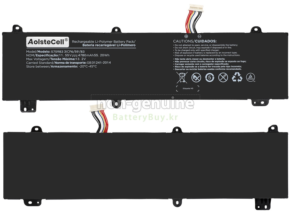 본 새로운 AolsteCell 575983 대체용 배터리는 삼성, 파나소닉과 LG 등 오리지날 공장의 고품질 리튬이온셀을 적용하였고, 배터리의 케이스는 내용성 ABS플라스틱을 사용한 제품입니다. BatteryBuy.kr는 제품 안전성에 대해 요구가 엄격한 바 해당 AolsteCell 575983 배터리 제품은 전부KC, CE, UL, ROHS, ISO 9001/9002 등 일련의 안전인증을 통과하여 국제표준에 부합되며 오리지날사의 규격과 100%로 호환가능하며 오리지널 575983 배터리와 완전 매칭 심지어 초과 가능한 성능을 자랑하고 있습니다. 해당 AolsteCell 575983 배터리의 충/방전 주기는 600회좌우인 바 최적의 배터리 라이프를 선사하고 있습니다.