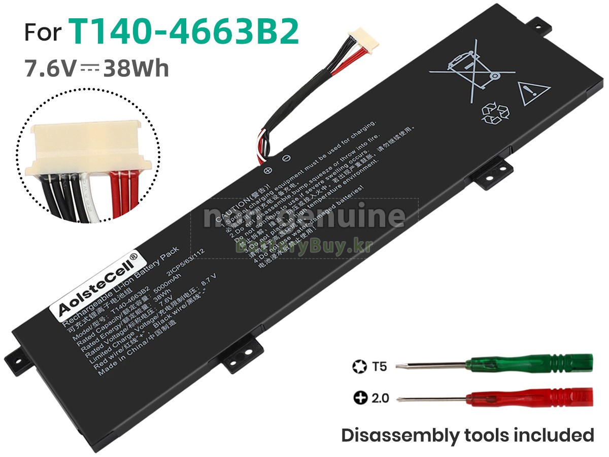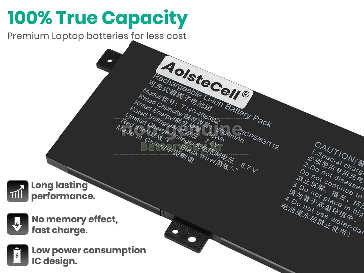본 새로운 AolsteCell T140-4663B2 대체용 배터리는 삼성, 파나소닉과 LG 등 오리지날 공장의 고품질 리튬이온셀을 적용하였고, 배터리의 케이스는 내용성 ABS플라스틱을 사용한 제품입니다. BatteryBuy.kr는 제품 안전성에 대해 요구가 엄격한 바 해당 AolsteCell T140-4663B2 배터리 제품은 전부KC, CE, UL, ROHS, ISO 9001/9002 등 일련의 안전인증을 통과하여 국제표준에 부합되며 오리지날사의 규격과 100%로 호환가능하며 오리지널 T140-4663B2 배터리와 완전 매칭 심지어 초과 가능한 성능을 자랑하고 있습니다. 해당 AolsteCell T140-4663B2 배터리의 충/방전 주기는 600회좌우인 바 최적의 배터리 라이프를 선사하고 있습니다.