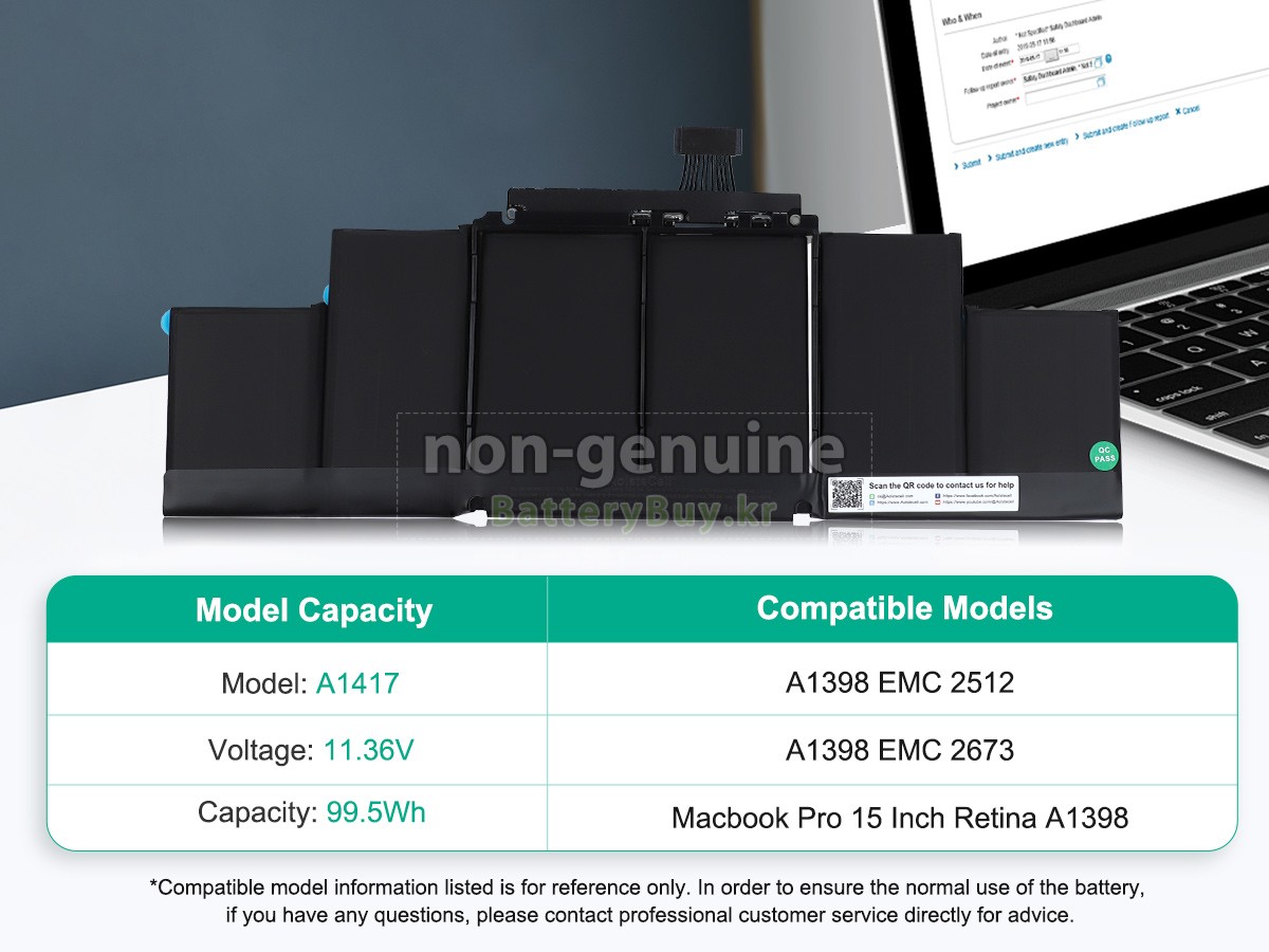 본 새로운 Apple A1417 대체용 배터리는 삼성, 파나소닉과 LG 등 오리지날 공장의 고품질 리튬이온셀을 적용하였고, 배터리의 케이스는 내용성 ABS플라스틱을 사용한 제품입니다. BatteryBuy.kr는 제품 안전성에 대해 요구가 엄격한 바 해당 Apple A1417 배터리 제품은 전부KC, CE, UL, ROHS, ISO 9001/9002 등 일련의 안전인증을 통과하여 국제표준에 부합되며 오리지날사의 규격과 100%로 호환가능하며 오리지널 A1417 배터리와 완전 매칭 심지어 초과 가능한 성능을 자랑하고 있습니다. 해당 Apple A1417 배터리의 충/방전 주기는 600회좌우인 바 최적의 배터리 라이프를 선사하고 있습니다.