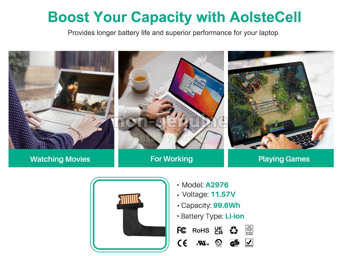 본 새로운 Apple A2976 대체용 배터리는 삼성, 파나소닉과 LG 등 오리지날 공장의 고품질 리튬이온셀을 적용하였고, 배터리의 케이스는 내용성 ABS플라스틱을 사용한 제품입니다. BatteryBuy.kr는 제품 안전성에 대해 요구가 엄격한 바 해당 Apple A2976 배터리 제품은 전부KC, CE, UL, ROHS, ISO 9001/9002 등 일련의 안전인증을 통과하여 국제표준에 부합되며 오리지날사의 규격과 100%로 호환가능하며 오리지널 A2976 배터리와 완전 매칭 심지어 초과 가능한 성능을 자랑하고 있습니다. 해당 Apple A2976 배터리의 충/방전 주기는 600회좌우인 바 최적의 배터리 라이프를 선사하고 있습니다.