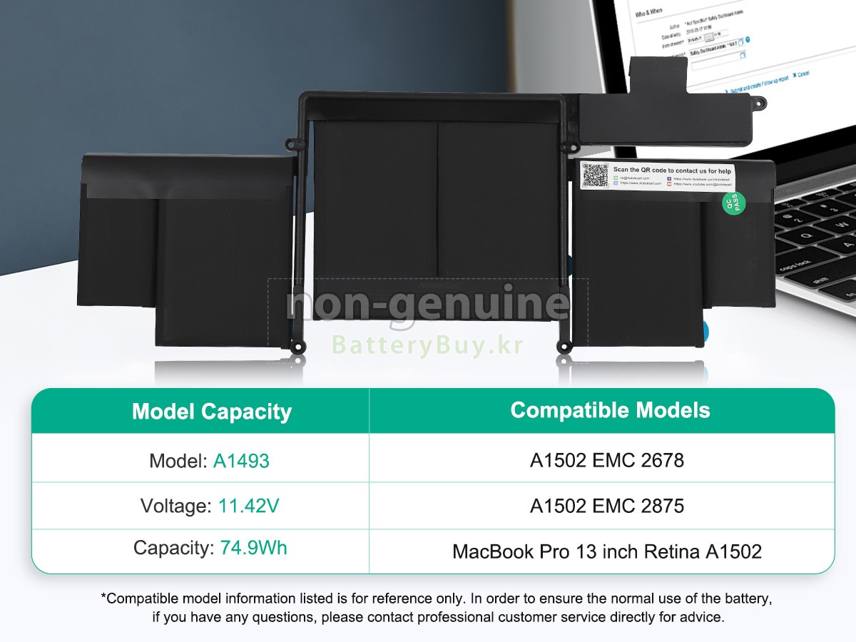 2 고객님의 원 Apple MacBook Pro Core I7 2.8GHZ 13.3 inch Retina A1502(EMC 2678) 배터리의 전압과 용량이 당사 제품과의 일치여부를 확인 후 당사의 확대 이미지에서 인터페이스, 대체적인 모양의 일치 여부를 확인하십시오.