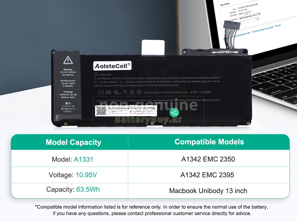 2 고객님의 원 Apple MacBook Unibody 13 inch 배터리의 전압과 용량이 당사 제품과의 일치여부를 확인 후 당사의 확대 이미지에서 인터페이스, 대체적인 모양의 일치 여부를 확인하십시오.