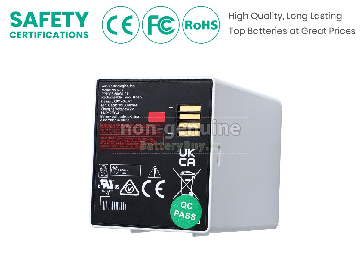 본 새로운 Arlo GO 2 대체용 배터리는 삼성, 파나소닉과 LG 등 오리지날 공장의 고품질 리튬이온셀을 적용하였고, 배터리의 케이스는 내용성 ABS플라스틱을 사용한 제품입니다. BatteryBuy.kr는 제품 안전성에 대해 요구가 엄격한 바 해당 Arlo GO 2 배터리 제품은 전부KC, CE, UL, ROHS, ISO 9001/9002 등 일련의 안전인증을 통과하여 국제표준에 부합되며 오리지날사의 규격과 100%로 호환가능하며 오리지널 GO 2 배터리와 완전 매칭 심지어 초과 가능한 성능을 자랑하고 있습니다. 해당 Arlo GO 2 배터리의 충/방전 주기는 600회좌우인 바 최적의 배터리 라이프를 선사하고 있습니다.
