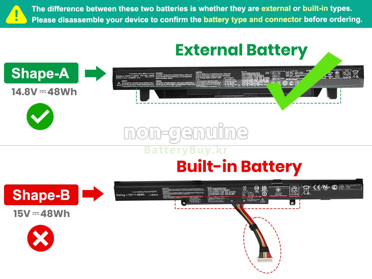 2 고객님의 원 Asus 7265NGW 배터리의 전압과 용량이 당사 제품과의 일치여부를 확인 후 당사의 확대 이미지에서 인터페이스, 대체적인 모양의 일치 여부를 확인하십시오.