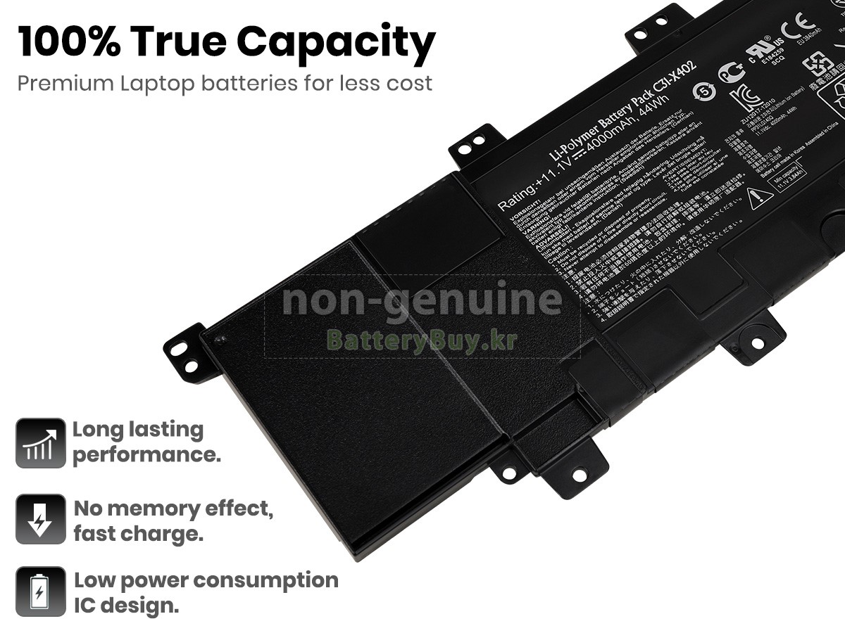 본 새로운 Asus C31-X402 대체용 배터리는 삼성, 파나소닉과 LG 등 오리지날 공장의 고품질 리튬이온셀을 적용하였고, 배터리의 케이스는 내용성 ABS플라스틱을 사용한 제품입니다. BatteryBuy.kr는 제품 안전성에 대해 요구가 엄격한 바 해당 Asus C31-X402 배터리 제품은 전부KC, CE, UL, ROHS, ISO 9001/9002 등 일련의 안전인증을 통과하여 국제표준에 부합되며 오리지날사의 규격과 100%로 호환가능하며 오리지널 C31-X402 배터리와 완전 매칭 심지어 초과 가능한 성능을 자랑하고 있습니다. 해당 Asus C31-X402 배터리의 충/방전 주기는 600회좌우인 바 최적의 배터리 라이프를 선사하고 있습니다.