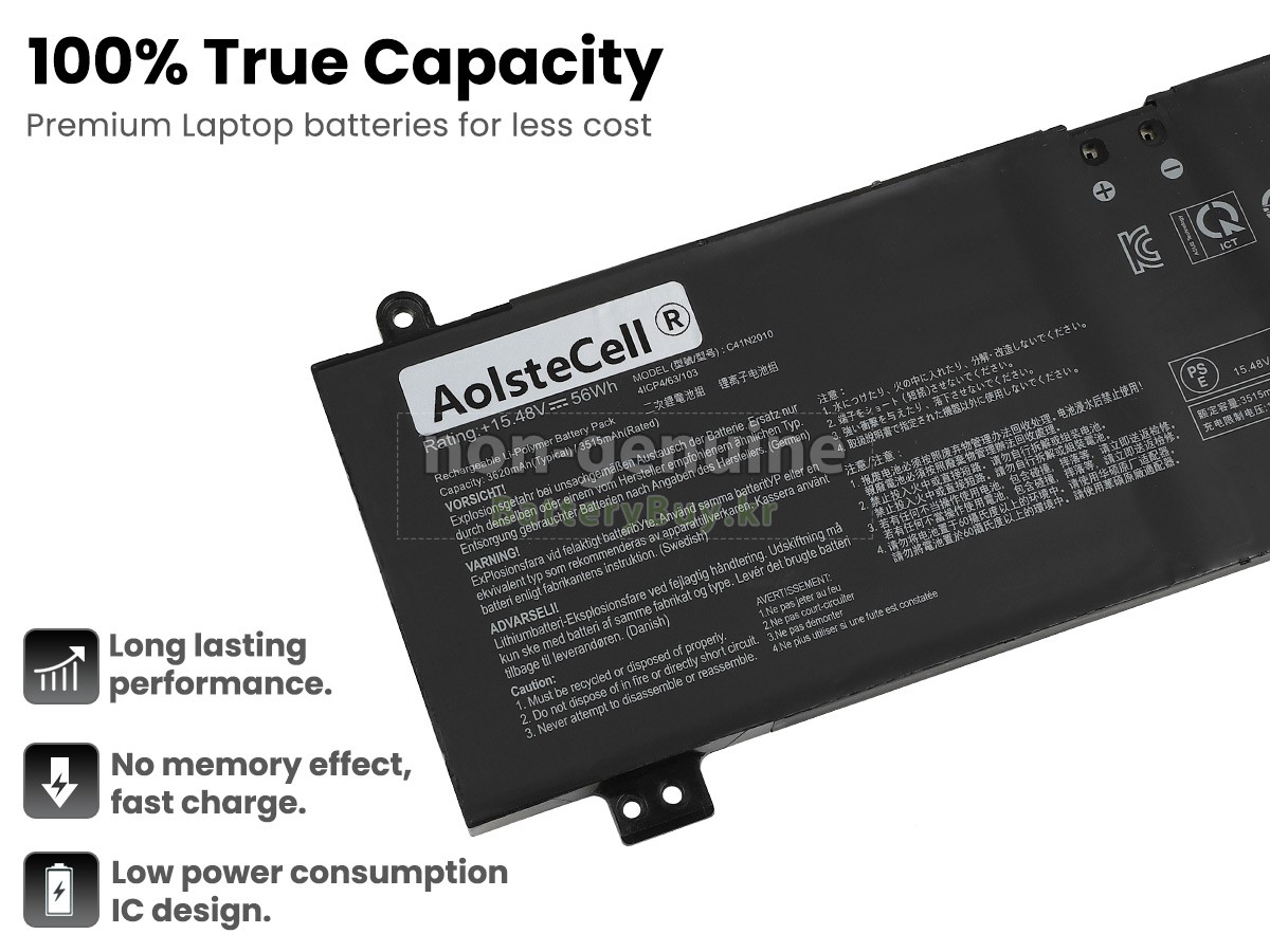 본 새로운 Asus TUF GAMING F17 FX707ZC-HX035 대체용 배터리는 삼성, 파나소닉과 LG 등 오리지날 공장의 고품질 리튬이온셀을 적용하였고, 배터리의 케이스는 내용성 ABS플라스틱을 사용한 제품입니다. BatteryBuy.kr는 제품 안전성에 대해 요구가 엄격한 바 해당 Asus TUF GAMING F17 FX707ZC-HX035 배터리 제품은 전부KC, CE, UL, ROHS, ISO 9001/9002 등 일련의 안전인증을 통과하여 국제표준에 부합되며 오리지날사의 규격과 100%로 호환가능하며 오리지널 TUF GAMING F17 FX707ZC-HX035 배터리와 완전 매칭 심지어 초과 가능한 성능을 자랑하고 있습니다. 해당 Asus TUF GAMING F17 FX707ZC-HX035 배터리의 충/방전 주기는 600회좌우인 바 최적의 배터리 라이프를 선사하고 있습니다.