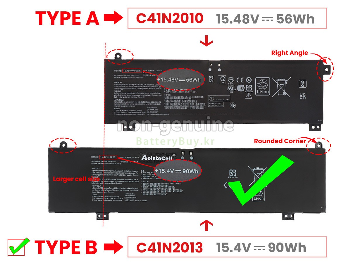 2 고객님의 원 Asus TUF GAMING F17 FX707ZC-HX035 배터리의 전압과 용량이 당사 제품과의 일치여부를 확인 후 당사의 확대 이미지에서 인터페이스, 대체적인 모양의 일치 여부를 확인하십시오.