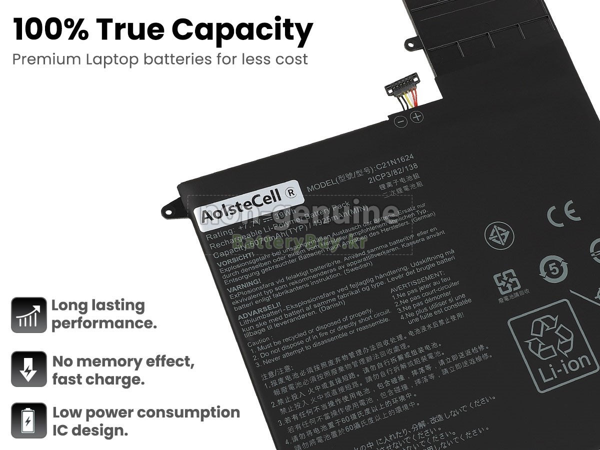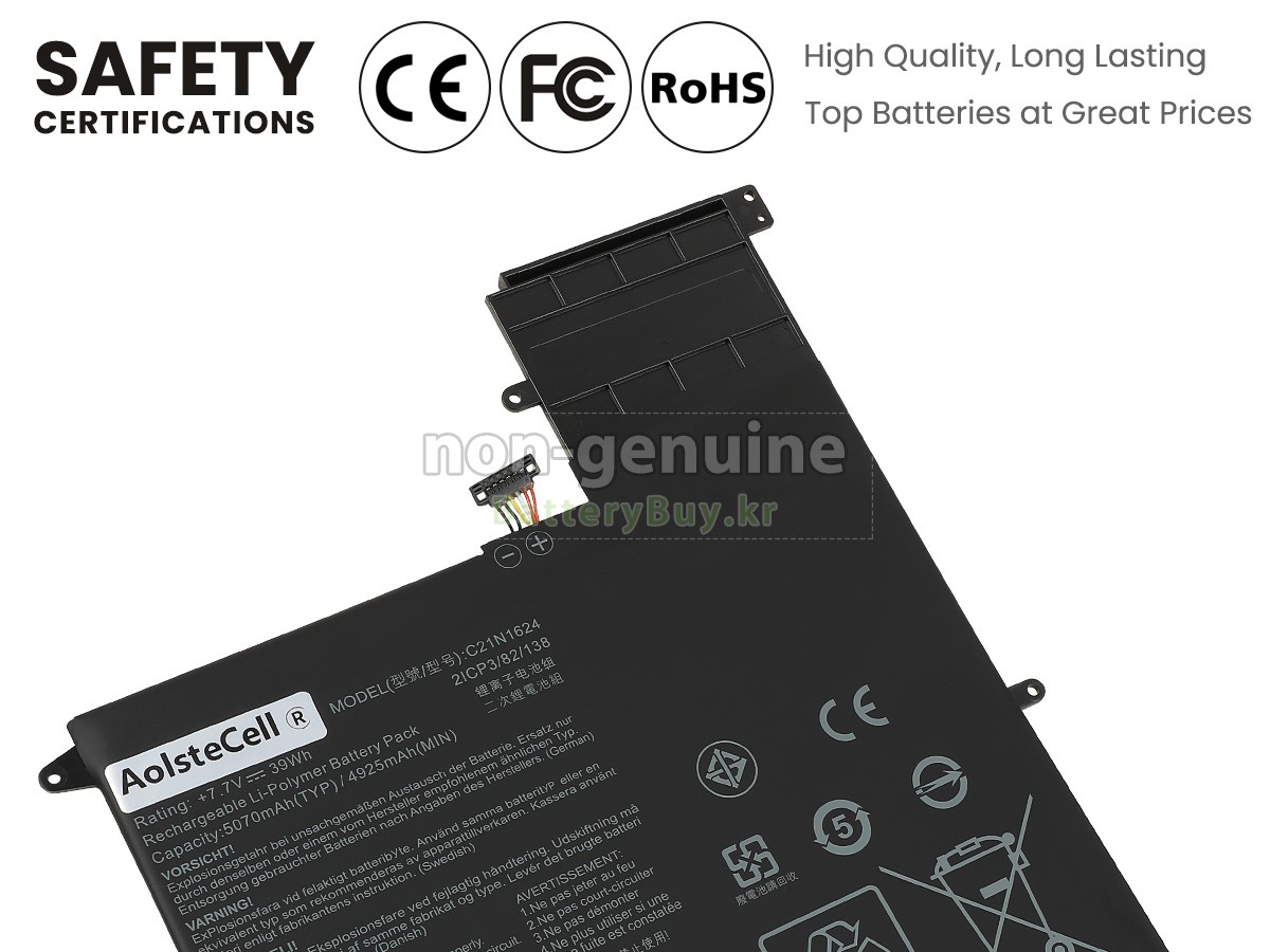 본 새로운 Asus ZenBook Flip S UX370UA-C4193T 대체용 배터리는 삼성, 파나소닉과 LG 등 오리지날 공장의 고품질 리튬이온셀을 적용하였고, 배터리의 케이스는 내용성 ABS플라스틱을 사용한 제품입니다. BatteryBuy.kr는 제품 안전성에 대해 요구가 엄격한 바 해당 Asus ZenBook Flip S UX370UA-C4193T 배터리 제품은 전부KC, CE, UL, ROHS, ISO 9001/9002 등 일련의 안전인증을 통과하여 국제표준에 부합되며 오리지날사의 규격과 100%로 호환가능하며 오리지널 ZenBook Flip S UX370UA-C4193T 배터리와 완전 매칭 심지어 초과 가능한 성능을 자랑하고 있습니다. 해당 Asus ZenBook Flip S UX370UA-C4193T 배터리의 충/방전 주기는 600회좌우인 바 최적의 배터리 라이프를 선사하고 있습니다.