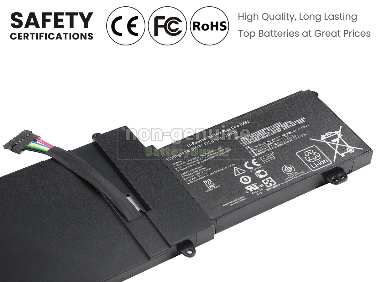 본 새로운 Asus ZenBook UX51VZ-DH71 대체용 배터리는 삼성, 파나소닉과 LG 등 오리지날 공장의 고품질 리튬이온셀을 적용하였고, 배터리의 케이스는 내용성 ABS플라스틱을 사용한 제품입니다. BatteryBuy.kr는 제품 안전성에 대해 요구가 엄격한 바 해당 Asus ZenBook UX51VZ-DH71 배터리 제품은 전부KC, CE, UL, ROHS, ISO 9001/9002 등 일련의 안전인증을 통과하여 국제표준에 부합되며 오리지날사의 규격과 100%로 호환가능하며 오리지널 ZenBook UX51VZ-DH71 배터리와 완전 매칭 심지어 초과 가능한 성능을 자랑하고 있습니다. 해당 Asus ZenBook UX51VZ-DH71 배터리의 충/방전 주기는 600회좌우인 바 최적의 배터리 라이프를 선사하고 있습니다.