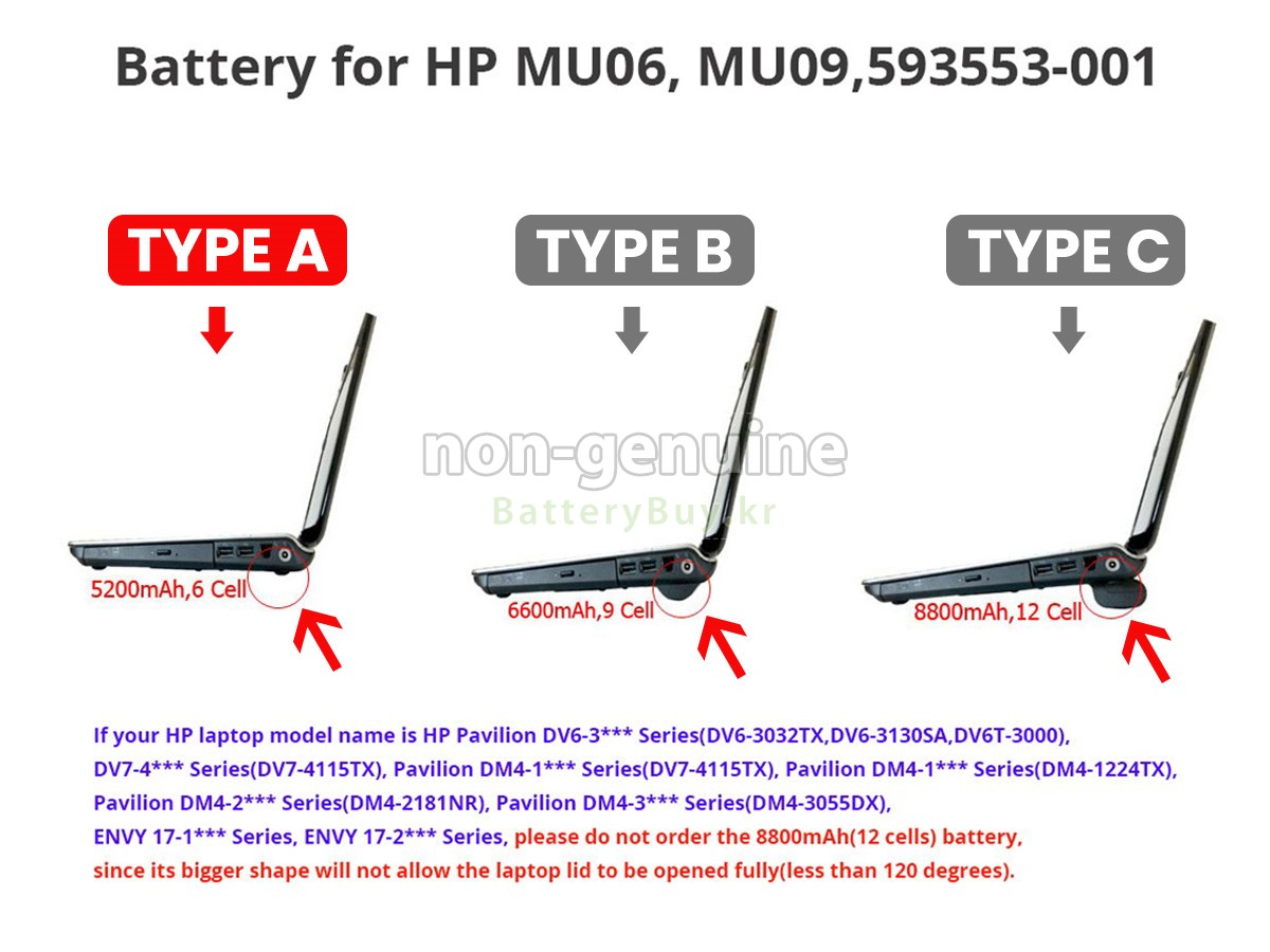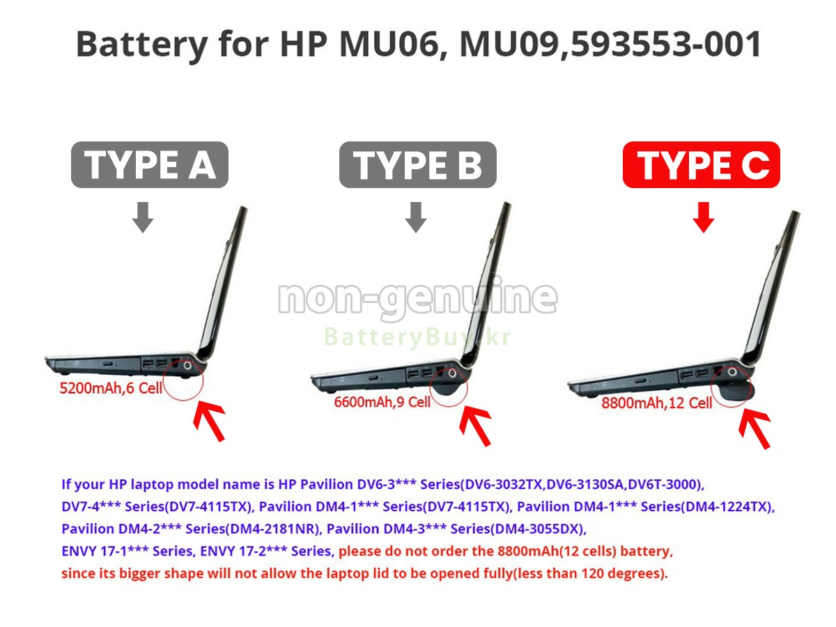 This is a high capacity battery, the bottom of this battery will extend out about 1 inch(bigger size). And if your laptop model name is HP Pavilion DV6-3030TX,DV6-3031TX,DV6-3032TX,Pavilion DV6-3000 Series,Pavilion DV7-4000 Series,Pavilion DM4-1000,DM4-2000,DM4-3000 Series,ENVY 17-1000, ENVY 17-2000 Series,please do not order this 8800mAh battery, since it does not allow the lid open fully. - 상품 번호KRB40
