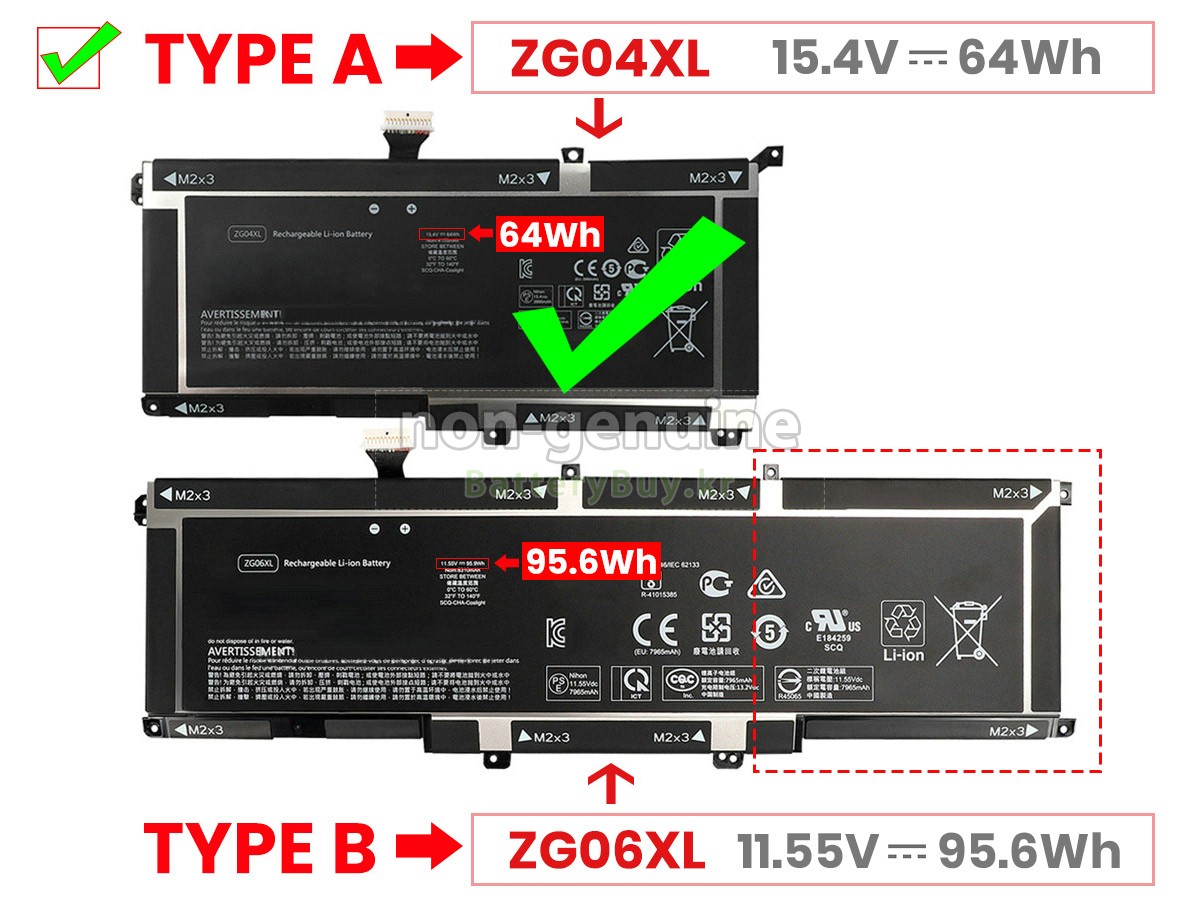 2 고객님의 원 HP ZG06095XL 배터리의 전압과 용량이 당사 제품과의 일치여부를 확인 후 당사의 확대 이미지에서 인터페이스, 대체적인 모양의 일치 여부를 확인하십시오.