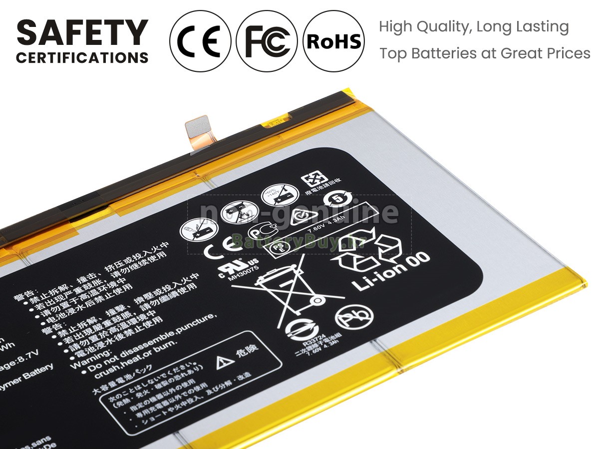 본 새로운 Huawei MATEBOOK E 대체용 배터리는 삼성, 파나소닉과 LG 등 오리지날 공장의 고품질 리튬이온셀을 적용하였고, 배터리의 케이스는 내용성 ABS플라스틱을 사용한 제품입니다. BatteryBuy.kr는 제품 안전성에 대해 요구가 엄격한 바 해당 Huawei MATEBOOK E 배터리 제품은 전부KC, CE, UL, ROHS, ISO 9001/9002 등 일련의 안전인증을 통과하여 국제표준에 부합되며 오리지날사의 규격과 100%로 호환가능하며 오리지널 MATEBOOK E 배터리와 완전 매칭 심지어 초과 가능한 성능을 자랑하고 있습니다. 해당 Huawei MATEBOOK E 배터리의 충/방전 주기는 600회좌우인 바 최적의 배터리 라이프를 선사하고 있습니다.