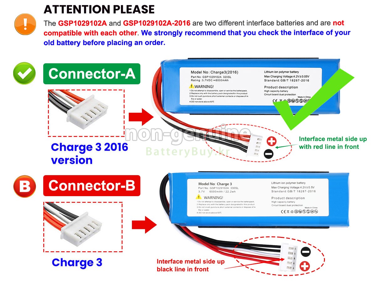2 고객님의 원 JBL CHARGE 3 2016 스피커 배터리의 전압과 용량이 당사 제품과의 일치여부를 확인 후 당사의 확대 이미지에서 인터페이스, 대체적인 모양의 일치 여부를 확인하십시오.