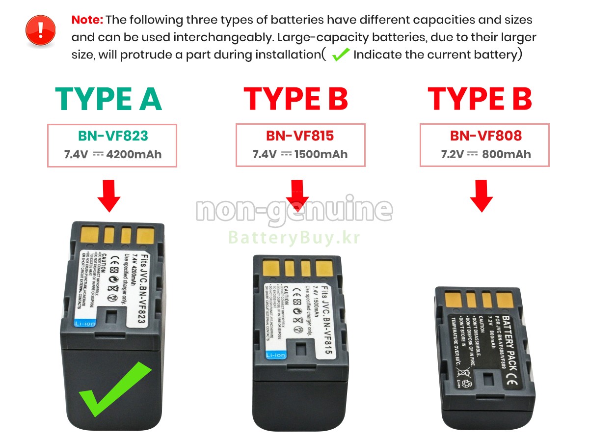 2 고객님의 원 JVC BN-VF809 배터리의 전압과 용량이 당사 제품과의 일치여부를 확인 후 당사의 확대 이미지에서 인터페이스, 대체적인 모양의 일치 여부를 확인하십시오.