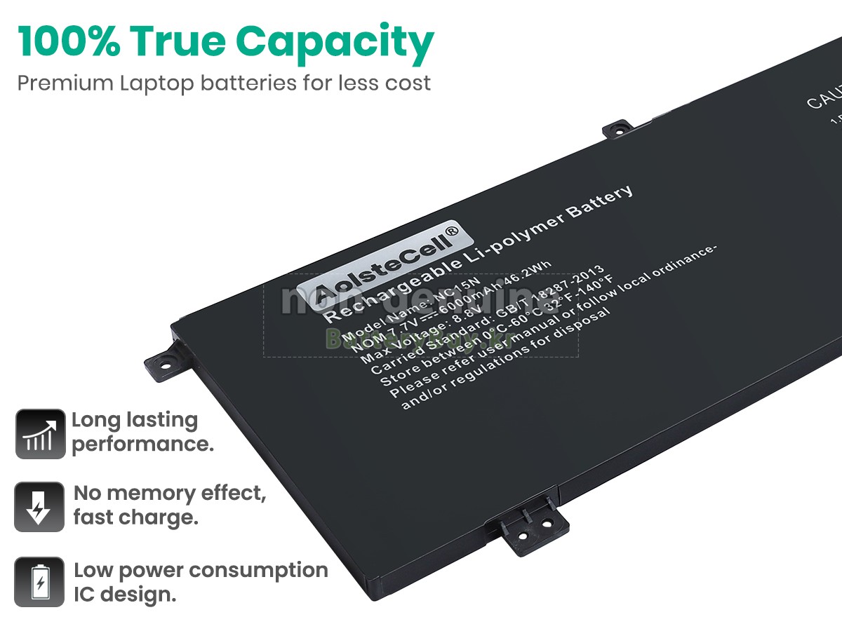 본 새로운 KuXi NC15U8 대체용 배터리는 삼성, 파나소닉과 LG 등 오리지날 공장의 고품질 리튬이온셀을 적용하였고, 배터리의 케이스는 내용성 ABS플라스틱을 사용한 제품입니다. BatteryBuy.kr는 제품 안전성에 대해 요구가 엄격한 바 해당 KuXi NC15U8 배터리 제품은 전부KC, CE, UL, ROHS, ISO 9001/9002 등 일련의 안전인증을 통과하여 국제표준에 부합되며 오리지날사의 규격과 100%로 호환가능하며 오리지널 NC15U8 배터리와 완전 매칭 심지어 초과 가능한 성능을 자랑하고 있습니다. 해당 KuXi NC15U8 배터리의 충/방전 주기는 600회좌우인 바 최적의 배터리 라이프를 선사하고 있습니다.