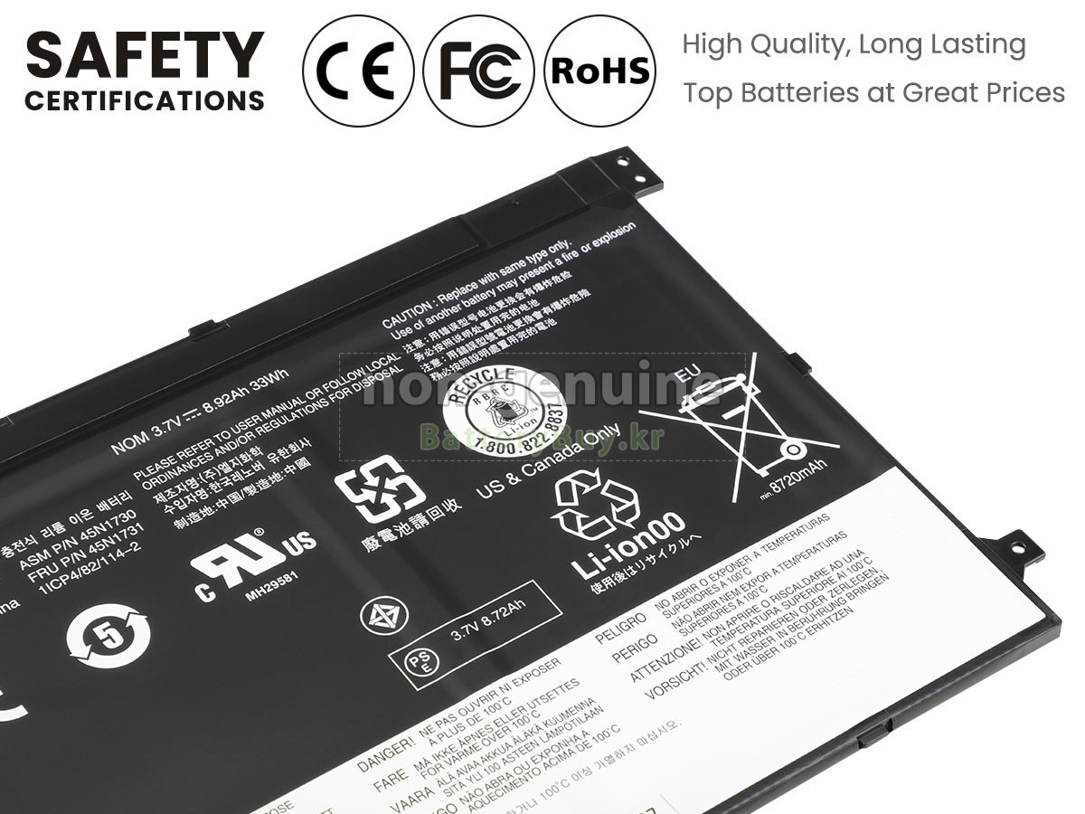 본 새로운 Lenovo 45N1733 대체용 배터리는 삼성, 파나소닉과 LG 등 오리지날 공장의 고품질 리튬이온셀을 적용하였고, 배터리의 케이스는 내용성 ABS플라스틱을 사용한 제품입니다. BatteryBuy.kr는 제품 안전성에 대해 요구가 엄격한 바 해당 Lenovo 45N1733 배터리 제품은 전부KC, CE, UL, ROHS, ISO 9001/9002 등 일련의 안전인증을 통과하여 국제표준에 부합되며 오리지날사의 규격과 100%로 호환가능하며 오리지널 45N1733 배터리와 완전 매칭 심지어 초과 가능한 성능을 자랑하고 있습니다. 해당 Lenovo 45N1733 배터리의 충/방전 주기는 600회좌우인 바 최적의 배터리 라이프를 선사하고 있습니다.