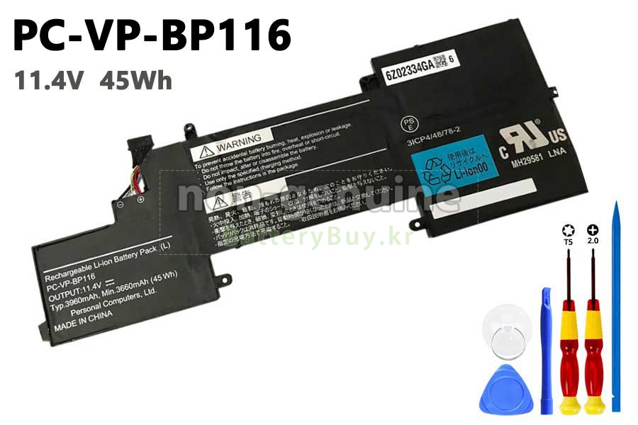 본 새로운 NEC PC-VP-BP116 대체용 배터리는 삼성, 파나소닉과 LG 등 오리지날 공장의 고품질 리튬이온셀을 적용하였고, 배터리의 케이스는 내용성 ABS플라스틱을 사용한 제품입니다. BatteryBuy.kr는 제품 안전성에 대해 요구가 엄격한 바 해당 NEC PC-VP-BP116 배터리 제품은 전부KC, CE, UL, ROHS, ISO 9001/9002 등 일련의 안전인증을 통과하여 국제표준에 부합되며 오리지날사의 규격과 100%로 호환가능하며 오리지널 PC-VP-BP116 배터리와 완전 매칭 심지어 초과 가능한 성능을 자랑하고 있습니다. 해당 NEC PC-VP-BP116 배터리의 충/방전 주기는 600회좌우인 바 최적의 배터리 라이프를 선사하고 있습니다.