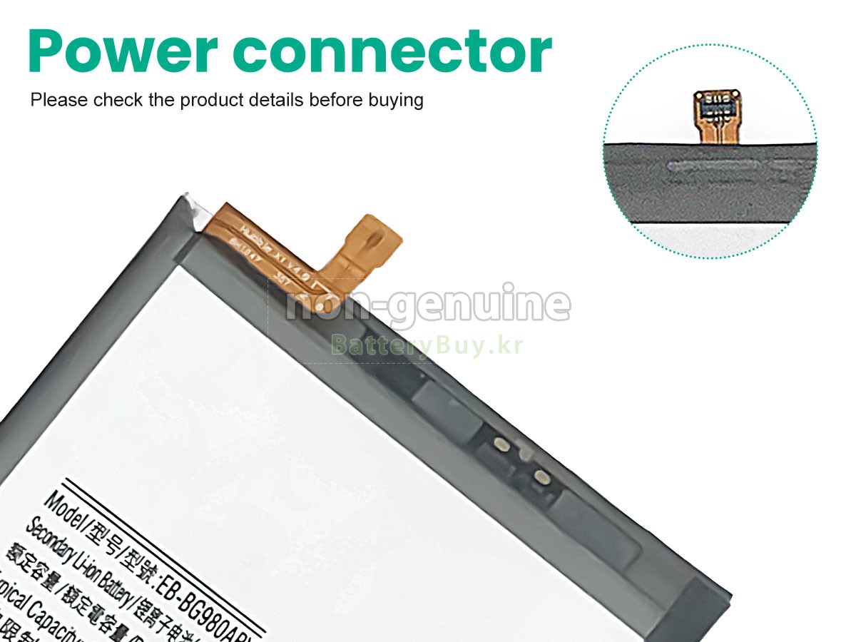 2 고객님의 원 Samsung GALAXY S20 SM-G980 배터리의 전압과 용량이 당사 제품과의 일치여부를 확인 후 당사의 확대 이미지에서 인터페이스, 대체적인 모양의 일치 여부를 확인하십시오.