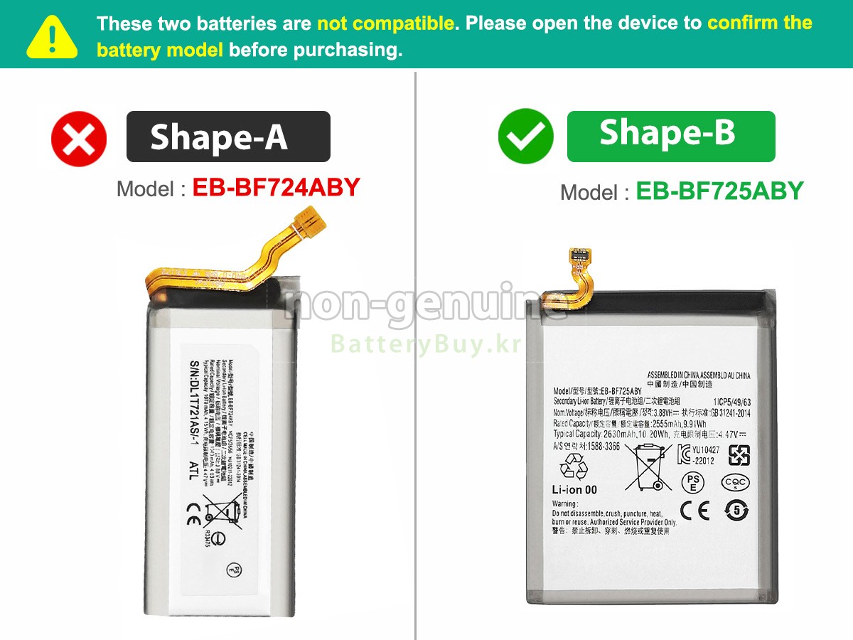 2 고객님의 원 Samsung GALAXY Z FLIP4 SM-F721U1 배터리의 전압과 용량이 당사 제품과의 일치여부를 확인 후 당사의 확대 이미지에서 인터페이스, 대체적인 모양의 일치 여부를 확인하십시오.