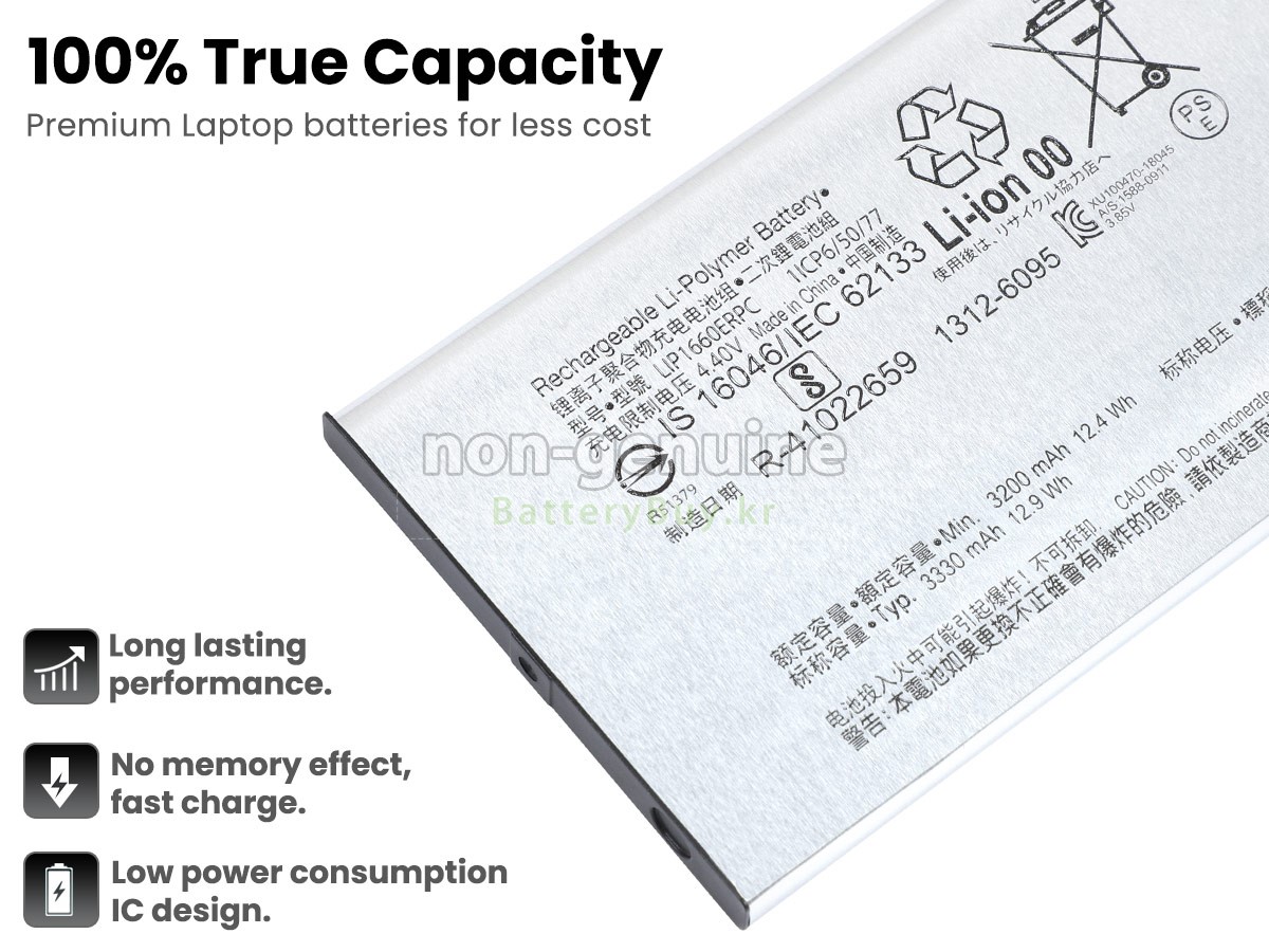 본 새로운 Sony XPERIA H9493 대체용 배터리는 삼성, 파나소닉과 LG 등 오리지날 공장의 고품질 리튬이온셀을 적용하였고, 배터리의 케이스는 내용성 ABS플라스틱을 사용한 제품입니다. BatteryBuy.kr는 제품 안전성에 대해 요구가 엄격한 바 해당 Sony XPERIA H9493 배터리 제품은 전부KC, CE, UL, ROHS, ISO 9001/9002 등 일련의 안전인증을 통과하여 국제표준에 부합되며 오리지날사의 규격과 100%로 호환가능하며 오리지널 XPERIA H9493 배터리와 완전 매칭 심지어 초과 가능한 성능을 자랑하고 있습니다. 해당 Sony XPERIA H9493 배터리의 충/방전 주기는 600회좌우인 바 최적의 배터리 라이프를 선사하고 있습니다.