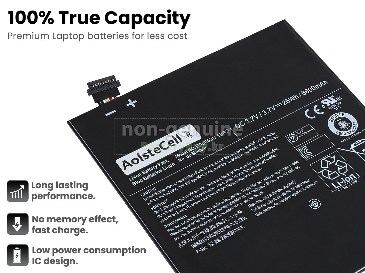 본 새로운 Toshiba PA5053U-1BRS 대체용 배터리는 삼성, 파나소닉과 LG 등 오리지날 공장의 고품질 리튬이온셀을 적용하였고, 배터리의 케이스는 내용성 ABS플라스틱을 사용한 제품입니다. BatteryBuy.kr는 제품 안전성에 대해 요구가 엄격한 바 해당 Toshiba PA5053U-1BRS 배터리 제품은 전부KC, CE, UL, ROHS, ISO 9001/9002 등 일련의 안전인증을 통과하여 국제표준에 부합되며 오리지날사의 규격과 100%로 호환가능하며 오리지널 PA5053U-1BRS 배터리와 완전 매칭 심지어 초과 가능한 성능을 자랑하고 있습니다. 해당 Toshiba PA5053U-1BRS 배터리의 충/방전 주기는 600회좌우인 바 최적의 배터리 라이프를 선사하고 있습니다.