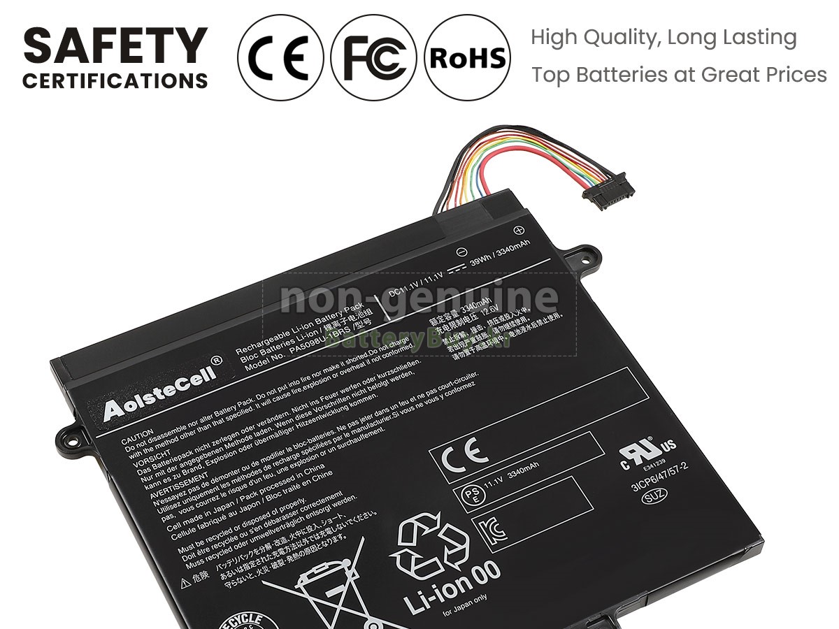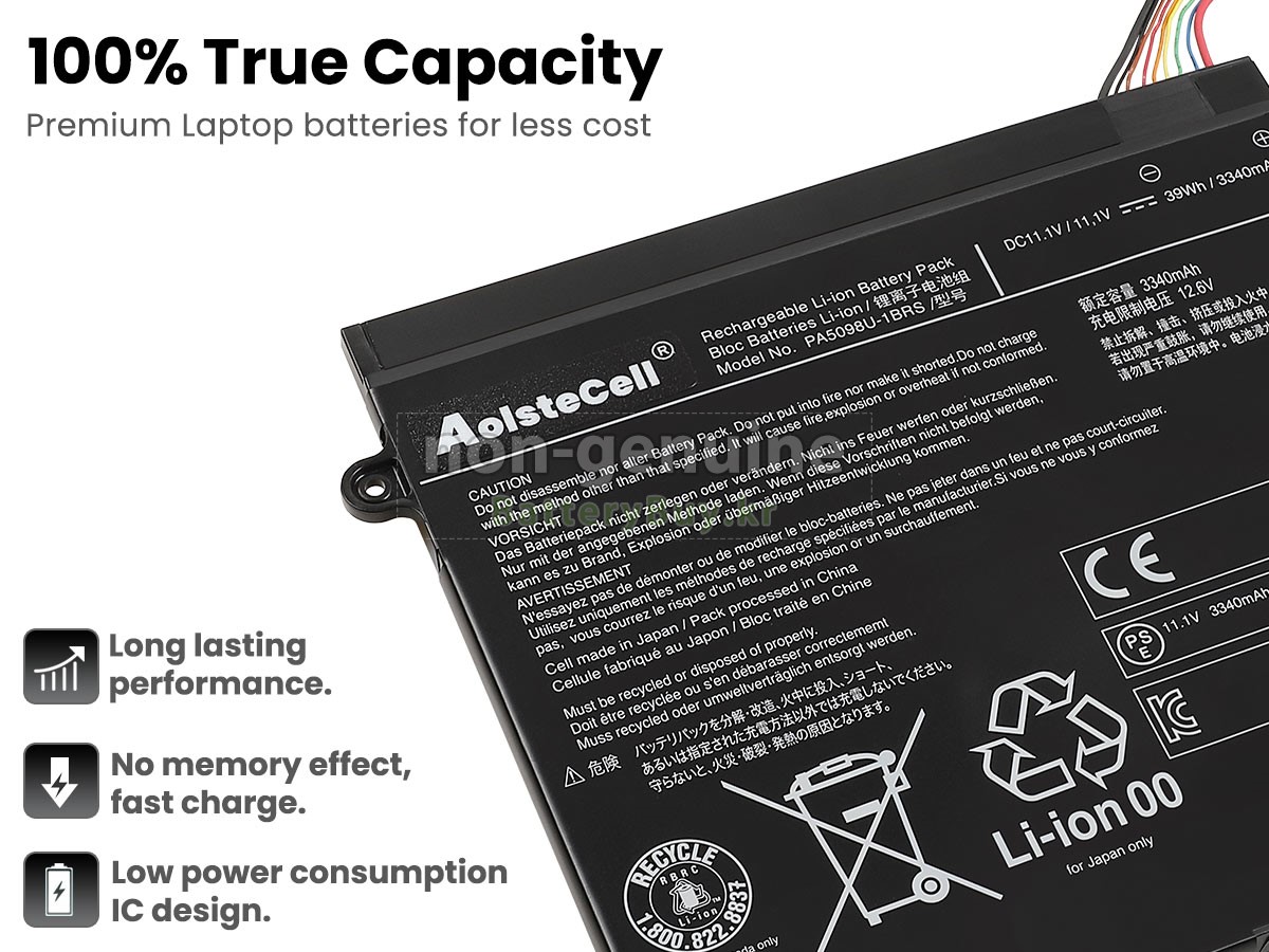 본 새로운 Toshiba PA5098U-1BRS(3ICP6/47/57-2) 대체용 배터리는 삼성, 파나소닉과 LG 등 오리지날 공장의 고품질 리튬이온셀을 적용하였고, 배터리의 케이스는 내용성 ABS플라스틱을 사용한 제품입니다. BatteryBuy.kr는 제품 안전성에 대해 요구가 엄격한 바 해당 Toshiba PA5098U-1BRS(3ICP6/47/57-2) 배터리 제품은 전부KC, CE, UL, ROHS, ISO 9001/9002 등 일련의 안전인증을 통과하여 국제표준에 부합되며 오리지날사의 규격과 100%로 호환가능하며 오리지널 PA5098U-1BRS(3ICP6/47/57-2) 배터리와 완전 매칭 심지어 초과 가능한 성능을 자랑하고 있습니다. 해당 Toshiba PA5098U-1BRS(3ICP6/47/57-2) 배터리의 충/방전 주기는 600회좌우인 바 최적의 배터리 라이프를 선사하고 있습니다.