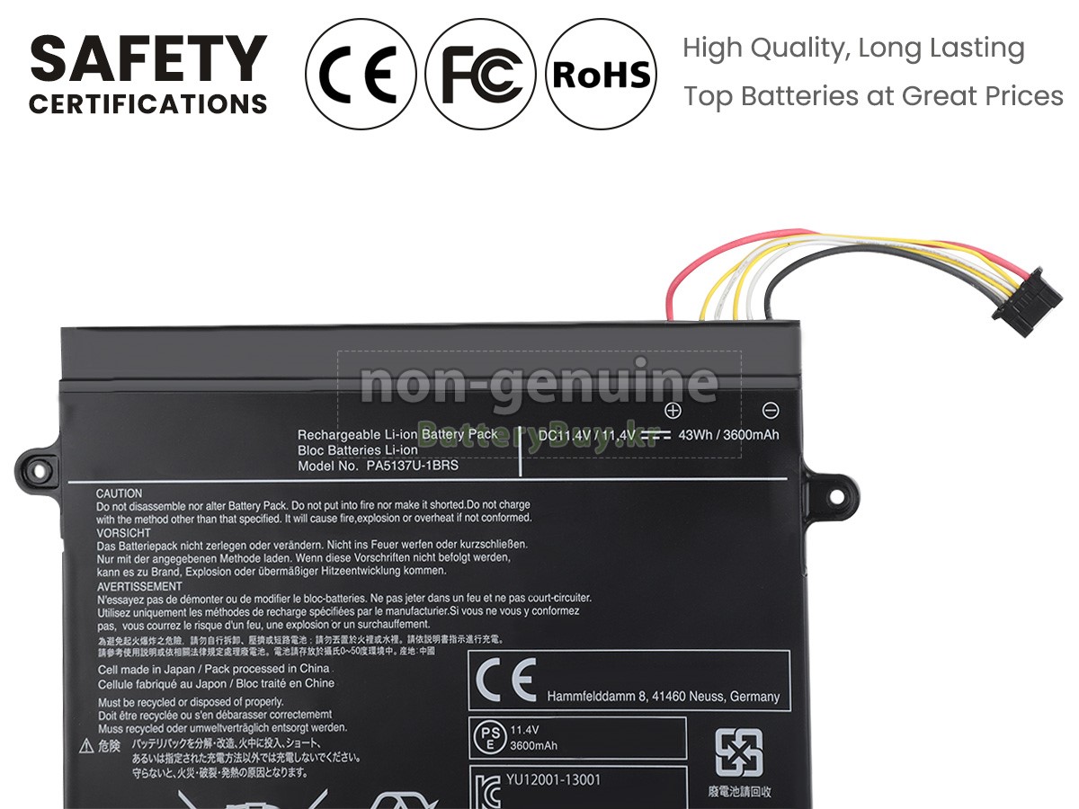 본 새로운 Toshiba PA5137U-1BRS 대체용 배터리는 삼성, 파나소닉과 LG 등 오리지날 공장의 고품질 리튬이온셀을 적용하였고, 배터리의 케이스는 내용성 ABS플라스틱을 사용한 제품입니다. BatteryBuy.kr는 제품 안전성에 대해 요구가 엄격한 바 해당 Toshiba PA5137U-1BRS 배터리 제품은 전부KC, CE, UL, ROHS, ISO 9001/9002 등 일련의 안전인증을 통과하여 국제표준에 부합되며 오리지날사의 규격과 100%로 호환가능하며 오리지널 PA5137U-1BRS 배터리와 완전 매칭 심지어 초과 가능한 성능을 자랑하고 있습니다. 해당 Toshiba PA5137U-1BRS 배터리의 충/방전 주기는 600회좌우인 바 최적의 배터리 라이프를 선사하고 있습니다.