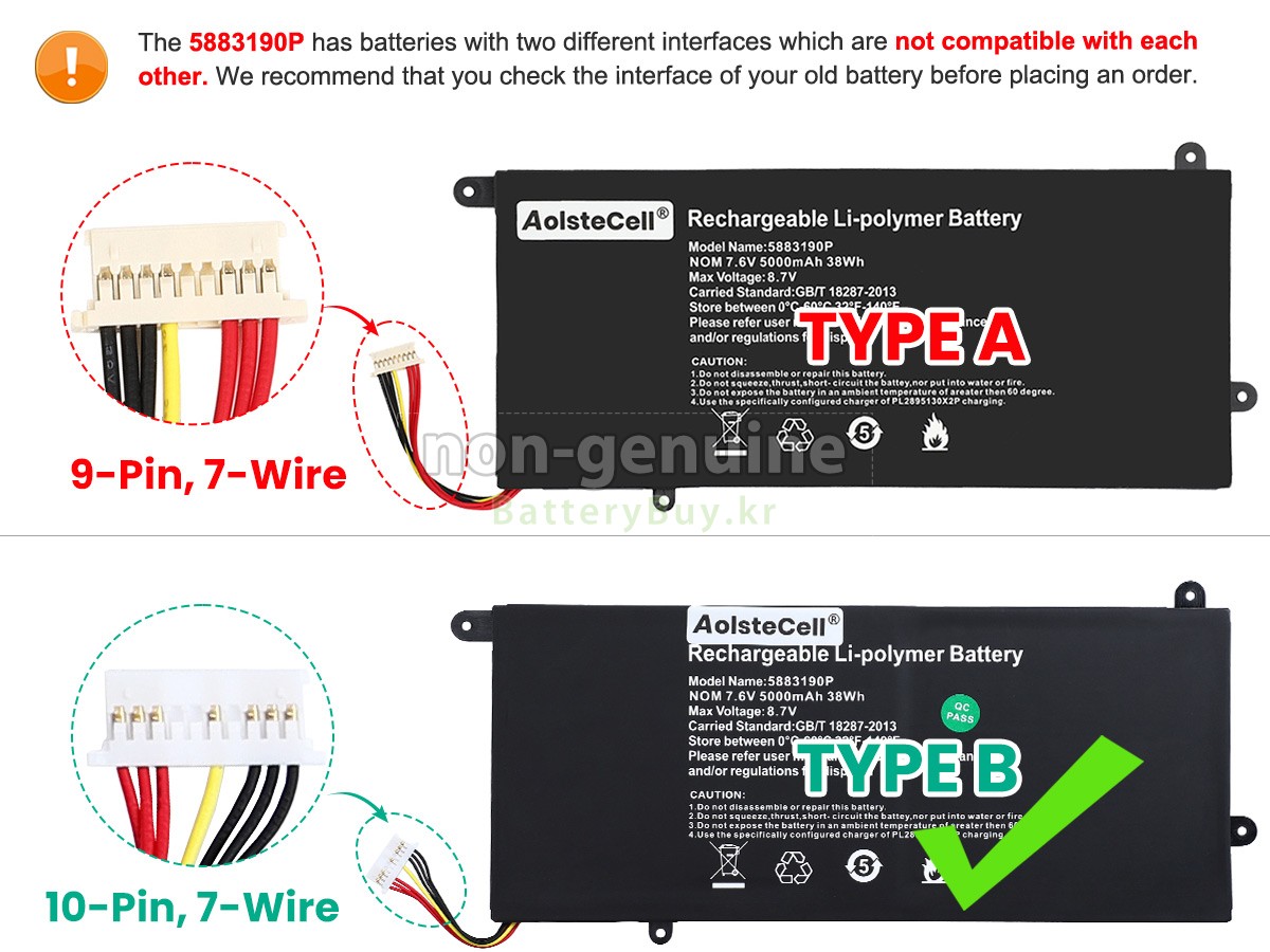 2 고객님의 원 Vastking 5883190P 배터리의 전압과 용량이 당사 제품과의 일치여부를 확인 후 당사의 확대 이미지에서 인터페이스, 대체적인 모양의 일치 여부를 확인하십시오.